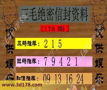 3d第2014178期三毛绝密信封资料图详解: 三码推荐:215 旺码推荐:79421和值推荐:09 13 16 24 三毛图库由3D之家3D图库频道原创,仅供彩民参考,温馨提供