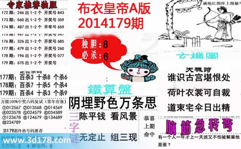 第179期冷热号码推荐:热码值:25 34冷码值:12 67主打码:2 4解冻码:6 3d布衣皇帝玄机诗:谁识古宫堪恨处荷叶衣裳可自裁到束宅伞日出精 该布衣图库由福彩3D之家3D图库频道原创,仅供彩民参考,温馨提供。