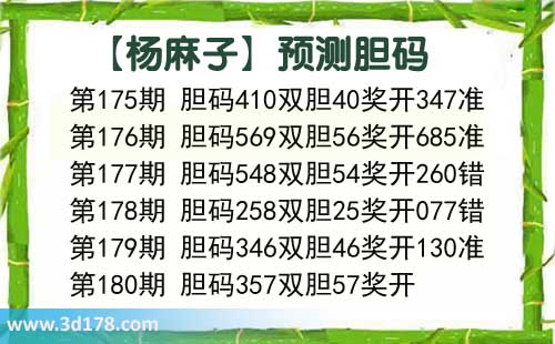 第175期 胆码410双胆40奖开347准第176期 胆码569双胆56奖开685准第177期 胆码548双胆54奖开260错第178期 胆码258双胆25奖开077错第179期 胆码346双胆46奖开130准第180期 胆码357双胆57奖开