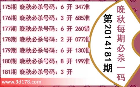 175期 晚秋必杀号码:6 开 347准176期 晚秋必杀号码:3 开 685准177期 晚秋必杀号码:6 开 260错178期 晚秋必杀号码:2 开 077准179期 晚秋必杀号码:6 开 130准180期 晚秋必杀号码:8 开 199准181期 晚秋必杀号码:3 开