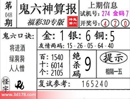 3d第24048期鬼六神算报为您推荐鬼六口诀: