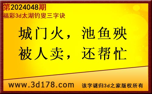 3d第2024048期太湖字谜:城门火,池鱼殃,被人卖,还帮忙