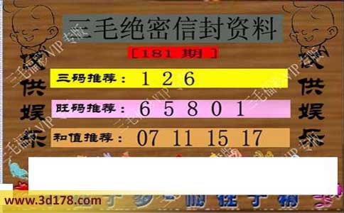 3d第2014181期三毛绝密信封资料图详解: 三码推荐:126 旺码推荐:65801 和值推荐:07 11 15 17 三毛图库由3D之家3D图库频道原创,仅供彩民参考,温馨提供。