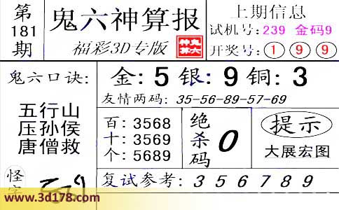 复式参考:356789三码推荐:金胆:5,银胆:9,铜胆:3定位复式:百位:3568十位:3569个位:5689 该鬼六图库由3D之家3D图库频道原创,仅供彩民参考,温馨提供。