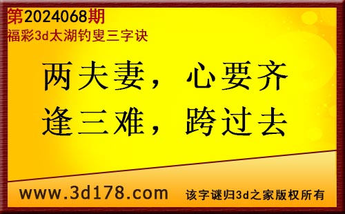 3d第2024068期太湖图库解字谜:两夫妻,心要齐,逢三难,跨过去