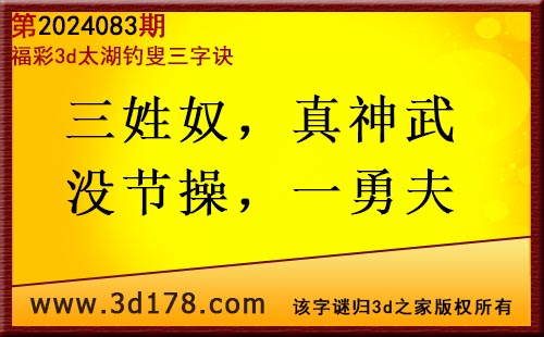 3d第2024083期太湖图库解字谜:三姓奴,真神武,没节操,一勇夫