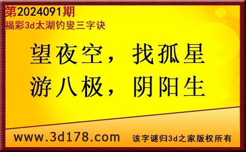 3d第2024091期太湖图库解字谜:望夜空,找孤星,游八极,阴阳生