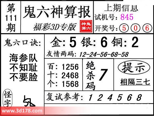 3d第24111期鬼六神算报为您推荐鬼六口诀:
