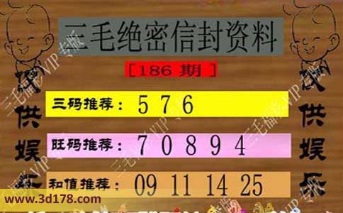 3d第2014186期三毛绝密信封资料图详解: 三码推荐:576旺码推荐:70894 和值推荐:09 11 14 25