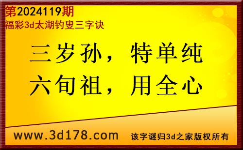 3d第202419期太湖图库解字谜:三岁孙,特单纯,六旬祖,用全心