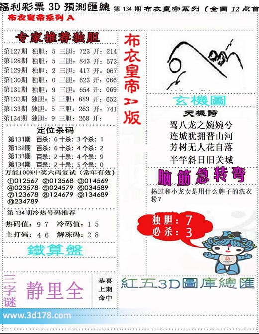 福彩3d第2024134期布衣皇帝布衣专家独家推荐: