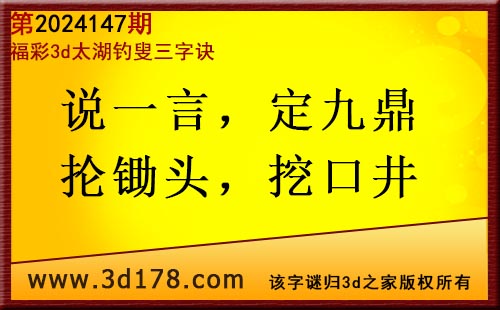 3d第2024147期太湖图库解字谜:说一言,定九鼎,抡锄头,挖口井