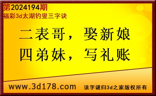 3d第2024194期太湖图库解字谜:二表哥,娶新娘,四弟妹,写礼账