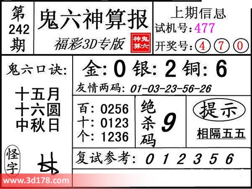 3d第24242期鬼六神算报为您推荐鬼六口诀: