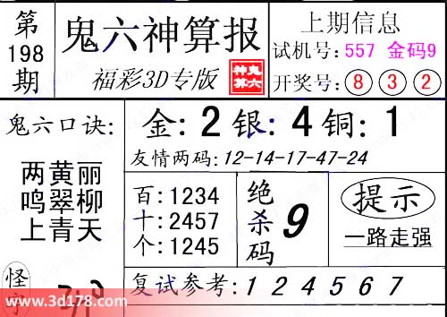 3d第2014198期鬼六神算报详解: 鬼六口诀:两黄丽