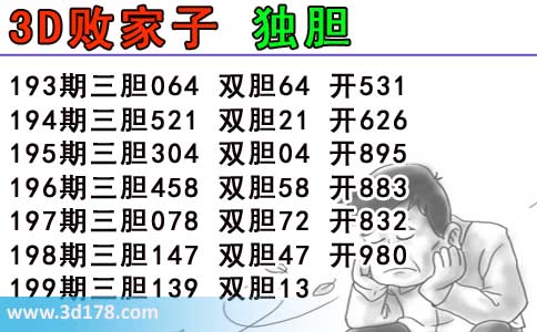 3d之家第2014199期3d败家子独胆图详解: 193期三胆064 双胆64 开531194期三胆521 双胆21 开626195期三胆304 双胆04 开895196期三胆458 双胆58 开883197期三胆078 双胆72 开832198期三胆147 双胆47 开980199期三胆139 双胆13 3d败家子双胆图库由3d之家3D图库频道原创,仅供彩民参考,温馨提供。