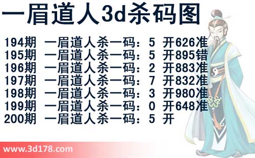 3d第2014200期一眉道人杀码图详解: 194期 一眉道人杀一码:5 开626准195期 一眉道人杀一码:5 开895错196期 一眉道人杀一码:2 开883准197期 一眉道人杀一码:7 开832准198期 一眉道人杀一码:3 开980准199期 一眉道人杀一码:0 开648准200期 一眉道人杀一码:5 开