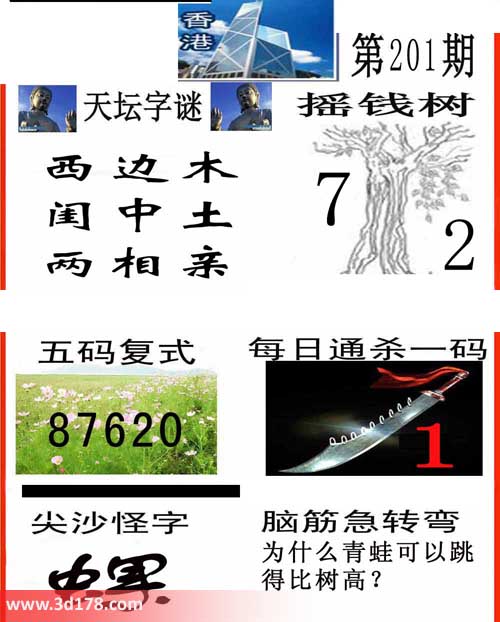 3d第2014201期香港彩报图推荐: 天坛字谜:西边木,闺中土,两相亲摇钱树:7 2五码复式:87620每日通杀一码:1尖沙怪字:螺 该香港彩报由福彩3D之家3D图库频道原创,仅供彩民参考,温馨提供。