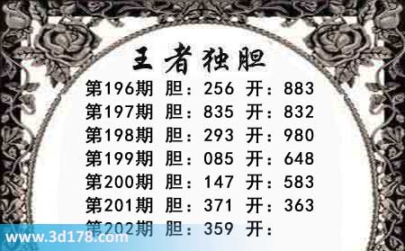 第195期 胆:475 开:895第196期 胆:256 开:883第197期 胆:835 开:832第198期 胆:293 开:980第199期 胆:085 开:648第200期 胆:147 开:583第201期 胆:371 开:363第202期 胆:359 开: 王者独胆图库由3d之家3D图库频道原创,仅供彩民参考,温馨提供。