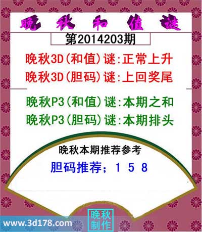 晚秋3D(胆码)谜:上回奖尾