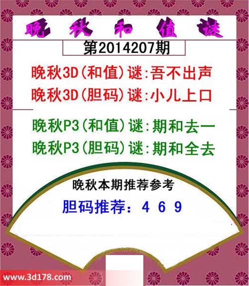 晚秋3D(和值)谜:吾不出声晚秋3D(胆码)谜:小儿上口晚秋P3(和值)谜:期和去一晚秋P3(胆码)谜:期和全去