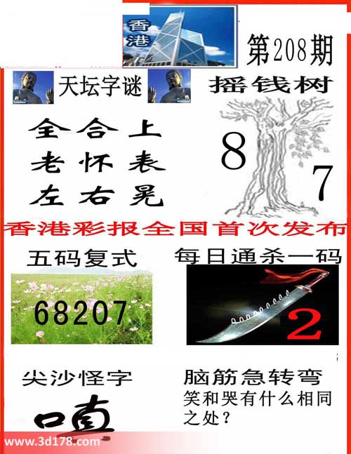 3d第2014208期香港彩报图推荐: 天坛字谜:全合上,老怀表,左右晃摇钱树:8 7五码复式:68207每日通杀一码:2尖沙怪字:嗔 该香港彩报由福彩3D之家3D图库频道原创,仅供彩民参考,温馨提供。