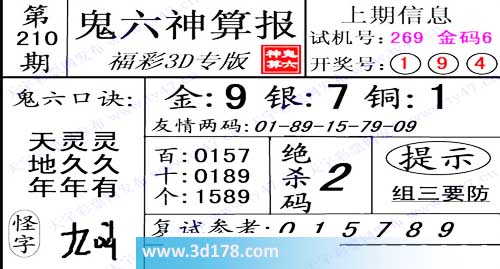 3d第2014210期鬼六神算报: