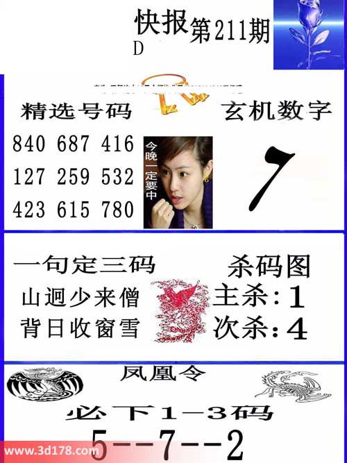 3d第2014211凤凰快报推荐: 玄机数字:7精选号码:840 678 416 127 259 532 423 615 780一句定三码:山迥少来僧背日收窗雪 杀码图:主杀:1次杀:4凤凰令:必下1-3码,5-7-2