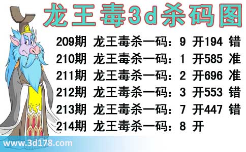 209期 龙王毒杀一码:9 开194 错210期 龙王毒杀一码:1 开585 准211期 龙王毒杀一码:2 开696 准212期 龙王毒杀一码:3 开553 错213期 龙王毒杀一码:7 开447 错214期 龙王毒杀一码:8 开