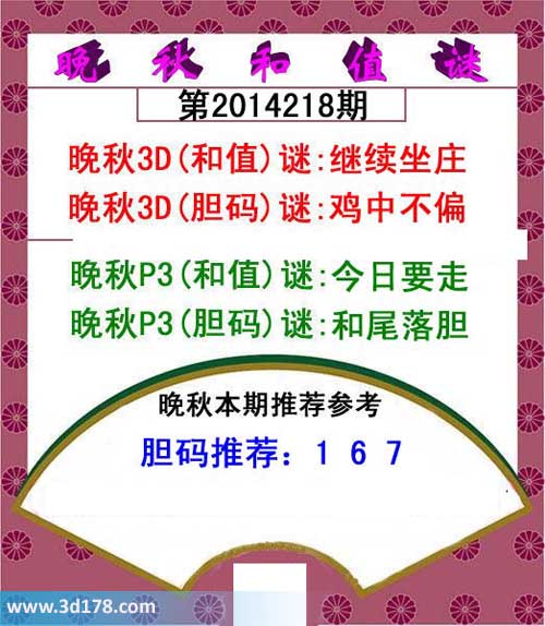 晚秋3D(和值)谜:继续坐庄晚秋3D(胆码)谜:鸡中不偏晚秋P3(和值)谜:今日要走晚秋P3(胆码)谜:和尾落胆