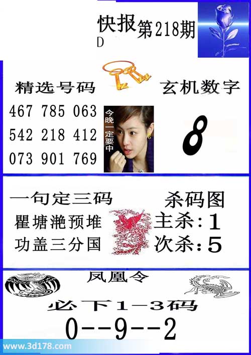 3d第2014218凤凰快报推荐: 玄机数字:8精选号码:467 785 063 542 218 412 073 901 769一句定三码:瞿塘滟预堆功盖三分国 杀码图:主杀:1次杀:5凤凰令:必下1-3码,0-9-2