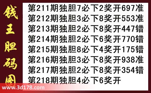 第211期独胆7必下2奖开697准第212期独胆3必下8奖开553准第213期独胆2必下8奖开447错第214期独胆2必下6奖开770错第215期独胆8必下4奖开175错第216期独胆3必下8奖开938准第217期独胆2必下8奖开354错第218期独胆4必下6奖开