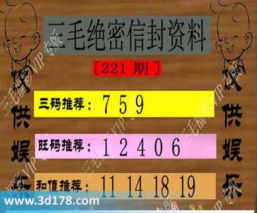 3d第2014221三毛绝密信封资料: 3d第2014221三毛绝密信封资料图详解: 三码推荐:759旺码推荐:1206和值推荐:11 14 18 19 三毛图库由3D之家3D图库频道原创,仅供彩民参考,温馨提供。