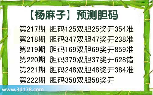3d第2014222杨麻子推荐: 第217期 胆码125双胆25奖开354准第218期 胆码347双胆47奖开238准第219期 胆码169双胆69奖开859准第220期 胆码379双胆37奖开628错第221期 胆码248双胆48奖开384准第222期 胆码358双胆58奖开