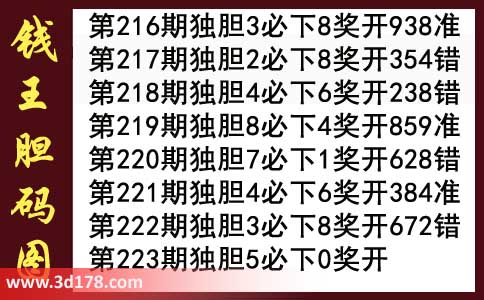 第216期独胆3必下8奖开938准第217期独胆2必下8奖开354错第218期独胆4必下6奖开238错第219期独胆8必下4奖开859准第220期独胆7必下1奖开628错第221期独胆4必下6奖开384准第222期独胆3必下8奖开672错第223期独胆5必下0奖开