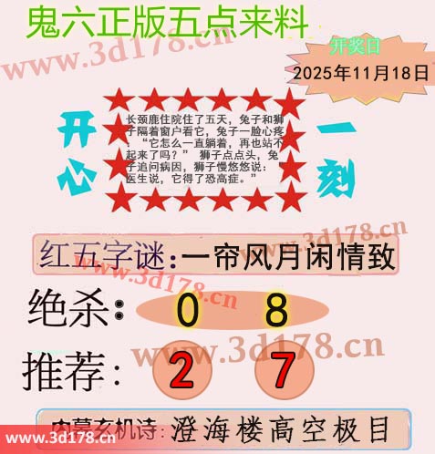 福彩3d第2025308期鬼六五点来料:
