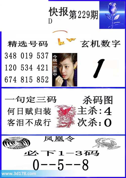 3d第2014229凤凰快报图: 3d第2014229凤凰快报推荐: 玄机数字:1精选号码:348 019 537 120 534 421 674 815 852一句定三码:何日赋归装客泪不成行 杀码图:主杀:4次杀:0凤凰令:必下1-3码,0-5-8