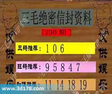 3d第2014230三毛绝密信封资料图详解: 三码推荐:106旺码推荐:95847和值推荐:11 14 18 19 三毛图库由3D之家3D图库频道原创,仅供彩民参考,温馨提供。