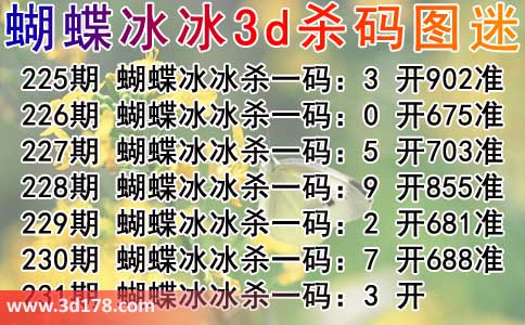 225期 蝴蝶冰冰杀一码:3 开902准226期 蝴蝶冰冰杀一码:0 开675准227期 蝴蝶冰冰杀一码:5 开703准228期 蝴蝶冰冰杀一码:9 开855准229期 蝴蝶冰冰杀一码:2 开681准230期 蝴蝶冰冰杀一码:7 开688准231期 蝴蝶冰冰杀一码:3 开 该蝴蝶冰冰杀码图由3D之家3D图库频道原创,仅供彩民参考,温馨提供。