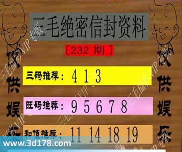 3d第2014232三毛绝密信封资料: 3d第2014232三毛绝密信封资料图详解: 三码推荐:413旺码推荐:95678和值推荐:11 14 18 19 三毛图库由3D之家3D图库频道原创,仅供彩民参考,温馨提供。