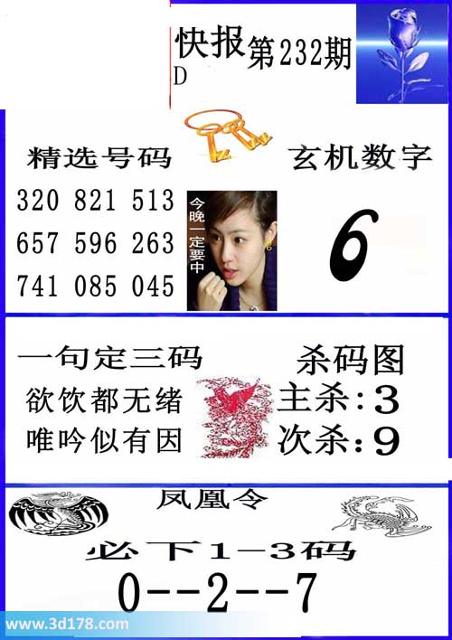3d第2014232凤凰快报推荐: 玄机数字:6精选号码:320 821 513 657 596 263 741 085 045一句定三码:欲饮都无绪唯吟似有因 杀码图:主杀:3次杀:9凤凰令:必下1-3码,0-2-7