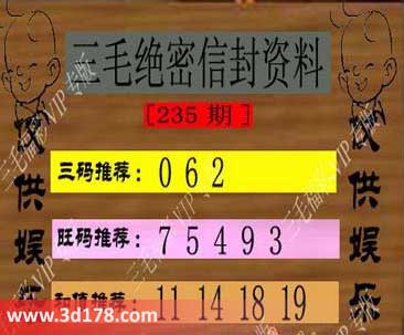 3d第2014235三毛绝密信封资料图详解: 三码推荐:062旺码推荐:75493和值推荐:11 14 18 19 三毛图库由3D之家3D图库频道原创,仅供彩民参考,温馨提供。