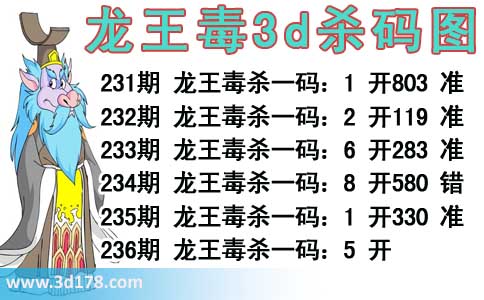 231期 龙王毒杀一码:1 开803 准232期 龙王毒杀一码:2 开119 准233期 龙王毒杀一码:6 开283 准234期 龙王毒杀一码:8 开580 错235期 龙王毒杀一码:1 开330 准236期 龙王毒杀一码:5 开