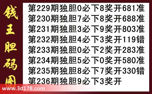 第229期独胆0必下8奖开681准第230期独胆7必下8奖开688准第231期独胆3必下9奖开803准第232期独胆4必下3奖开119错第233期独胆0必下2奖开283准第234期独胆5必下0奖开580准第235期独胆8必下7奖开330错第236期独胆9必下3奖开