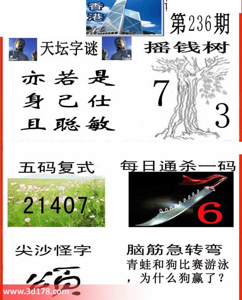 3d第2014236期香港彩报图推荐: 天坛字谜:亦若是,身己仕且聪敏摇钱树:7 3五码复式:21407每日通杀一码:6尖沙怪字:颂 该香港彩报由福彩3D之家3D图库频道原创,仅供彩民参考,温馨提供。