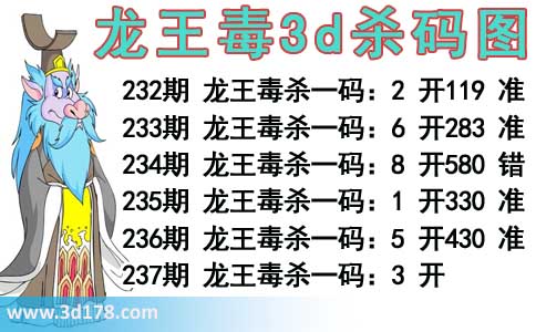 232期 龙王毒杀一码:2 开119 准233期 龙王毒杀一码:6 开283 准234期 龙王毒杀一码:8 开580 错235期 龙王毒杀一码:1 开330 准236期 龙王毒杀一码:5 开430 准237期 龙王毒杀一码:3 开