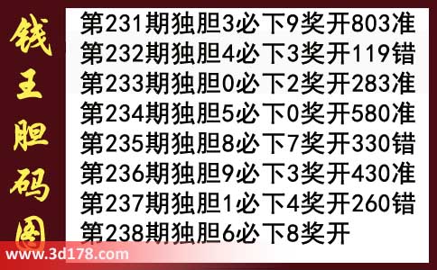 第230期独胆7必下8奖开688准第231期独胆3必下9奖开803准第232期独胆4必下3奖开119错第233期独胆0必下2奖开283准第234期独胆5必下0奖开580准第235期独胆8必下7奖开330错第236期独胆9必下3奖开430准第237期独胆1必下4奖开260错第238期独胆6必下8奖开