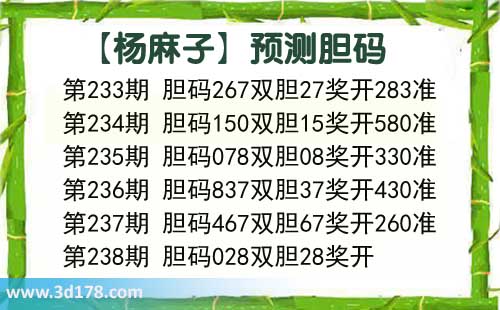 第232期 胆码457双胆47奖开119错第233期 胆码267双胆27奖开283准第234期 胆码150双胆15奖开580准第235期 胆码078双胆08奖开330准第236期 胆码837双胆37奖开430准第237期 胆码467双胆67奖开260准第238期 胆码028双胆28奖开
