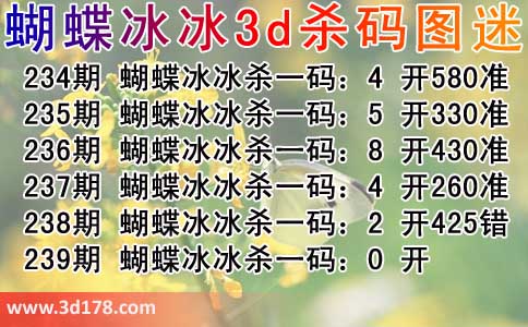 3d第2014239蝴蝶冰冰杀码图: 234期 蝴蝶冰冰杀一码:4 开580准235期 蝴蝶冰冰杀一码:5 开330准236期 蝴蝶冰冰杀一码:8 开430准237期 蝴蝶冰冰杀一码:4 开260准238期 蝴蝶冰冰杀一码:2 开425错239期 蝴蝶冰冰杀一码:0 开