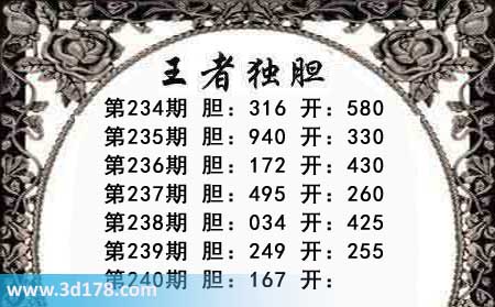 第234期 胆:316 开:580第235期 胆:940 开:330第236期 胆:172 开:430第237期 胆:495 开:260第238期 胆:034 开:425第239期 胆:249 开:255第240期 胆:167 开: